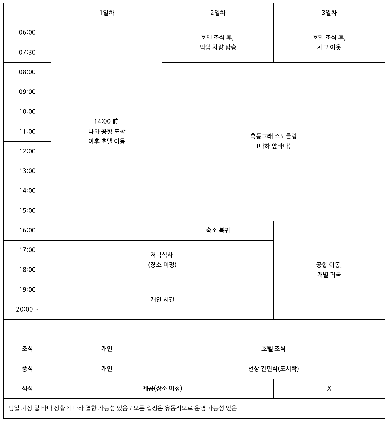 혹등고래 스노클링 투어 / 가이드비 & 보험 / 숙박 (2인 1실 기준) / 조식 · 중식 · 석식 / 렌탈 장비 일체